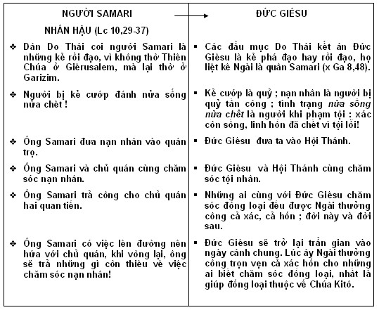 Samari nhân hậu. Nhưng để nhận ra những điểm giáo huấn ta phải thực hành nhằm diễn tả Đức Ái Kitô giáo, ta hãy so sánh